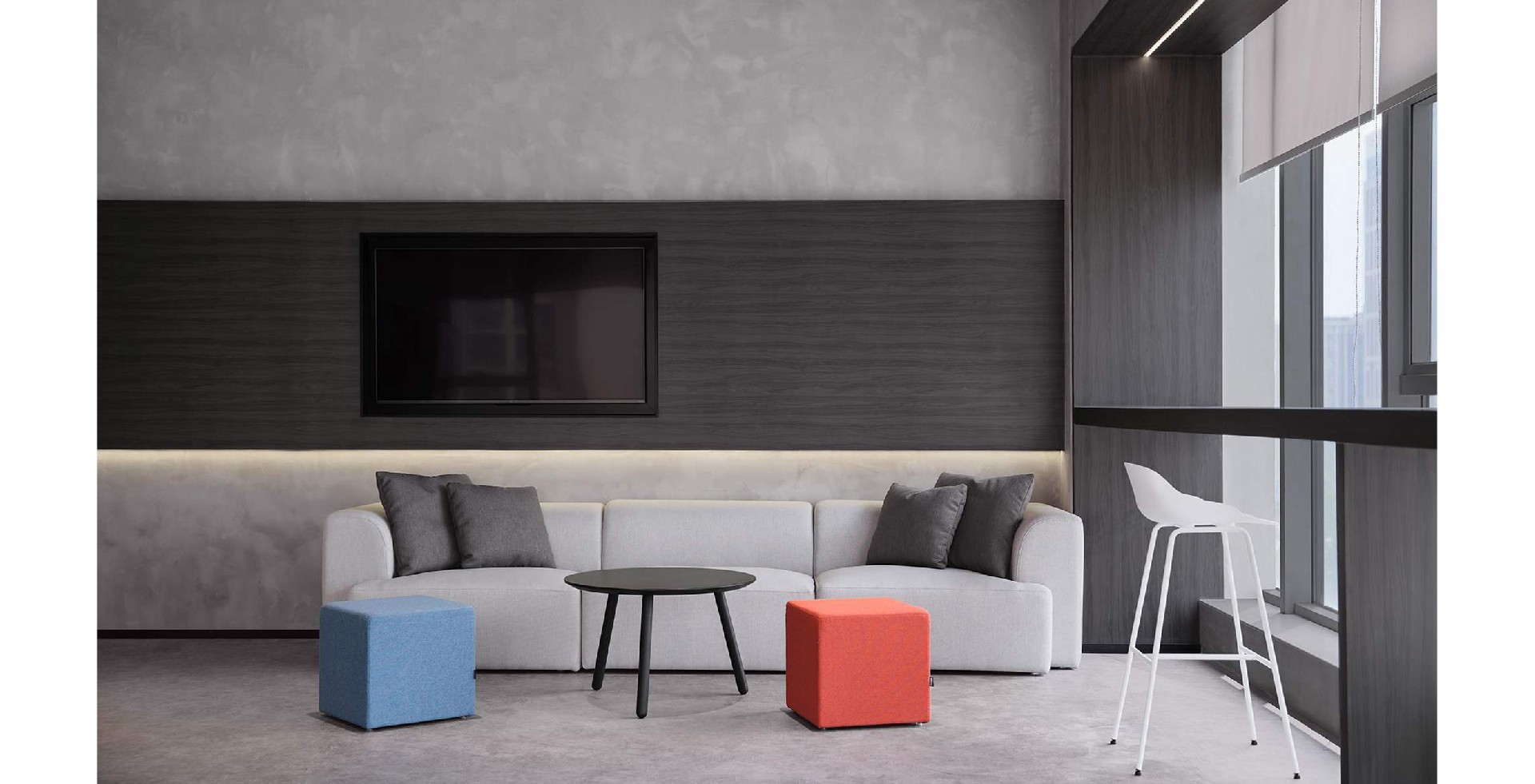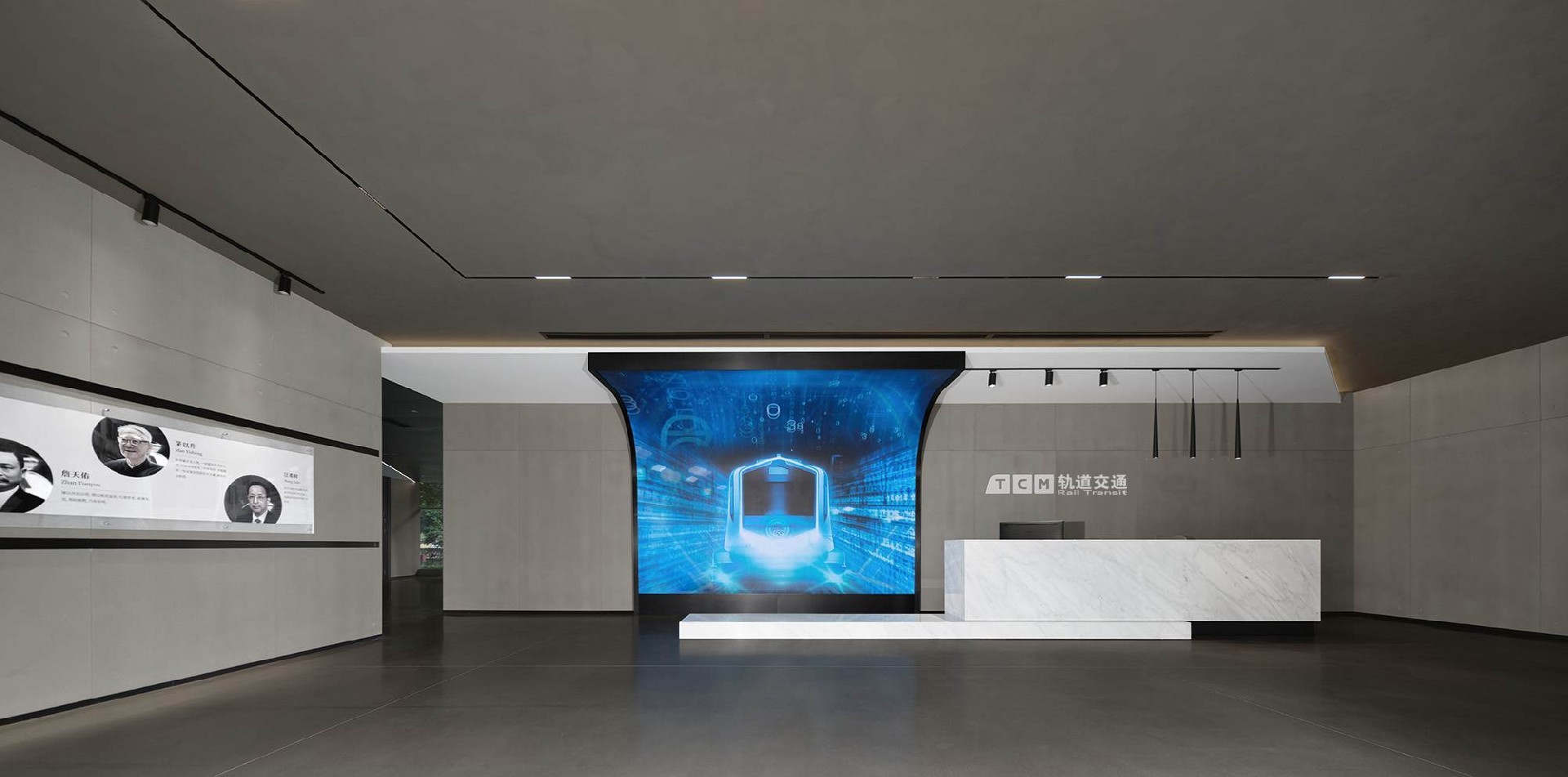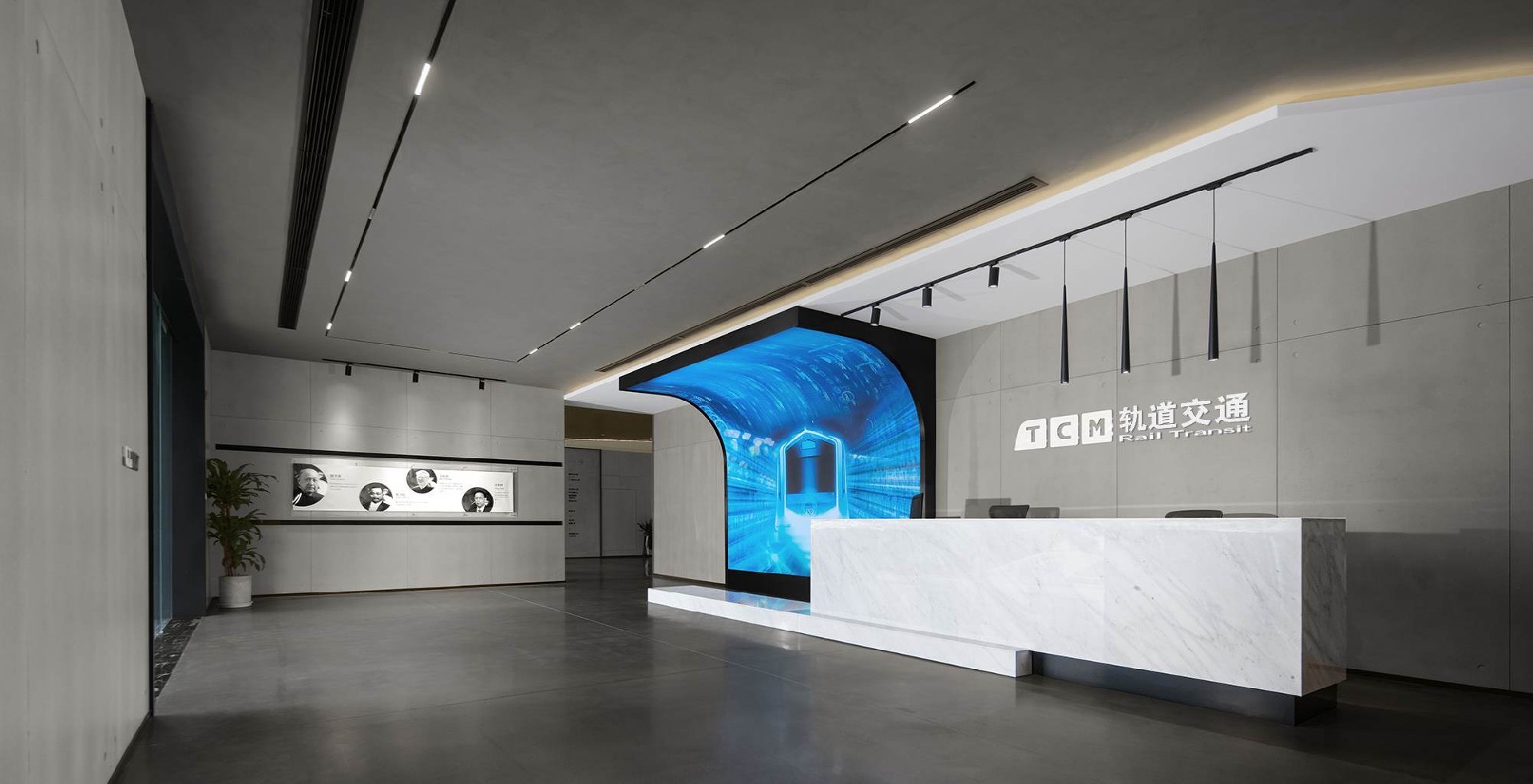 The blue gray color scheme of the rail transit office is calm and atmospheric,