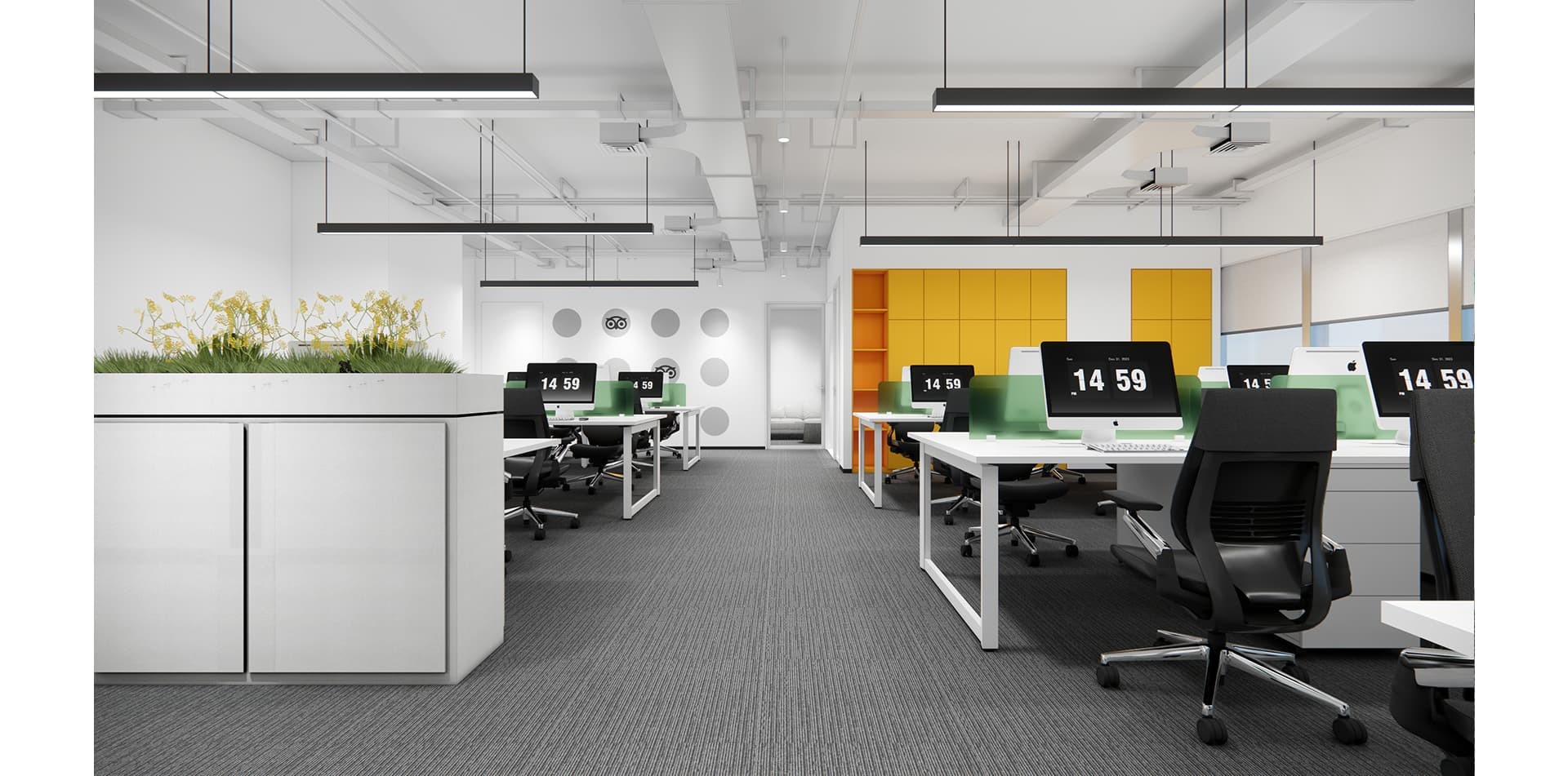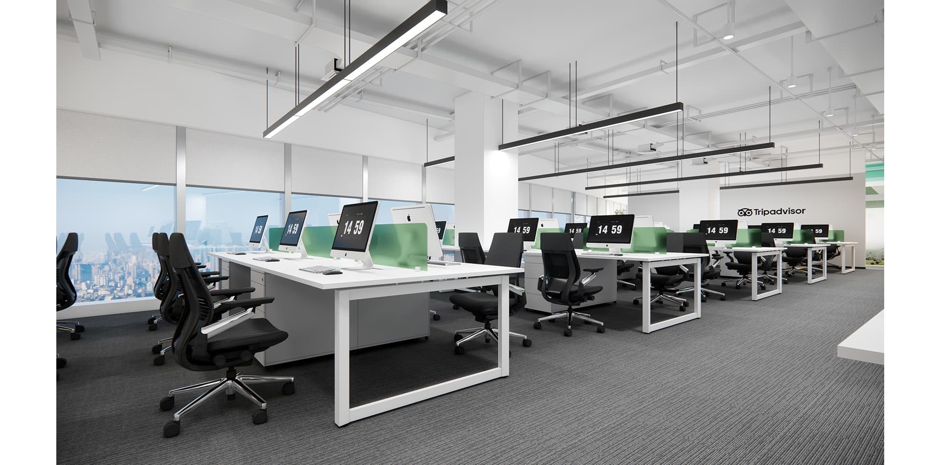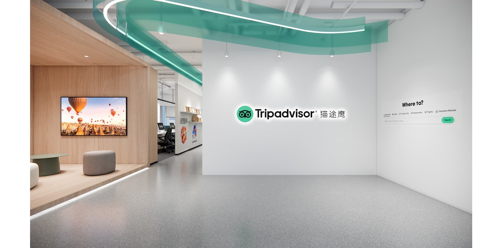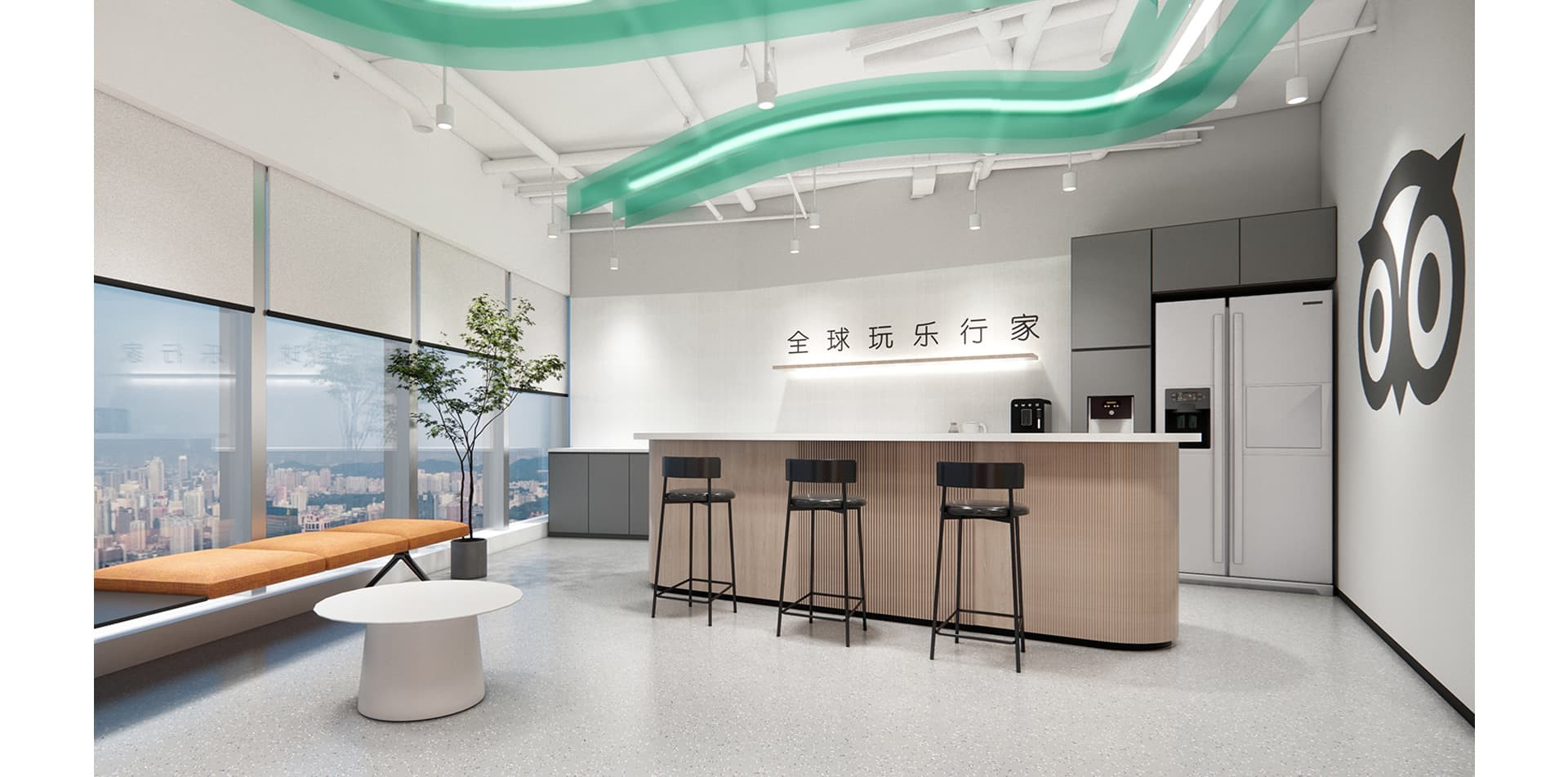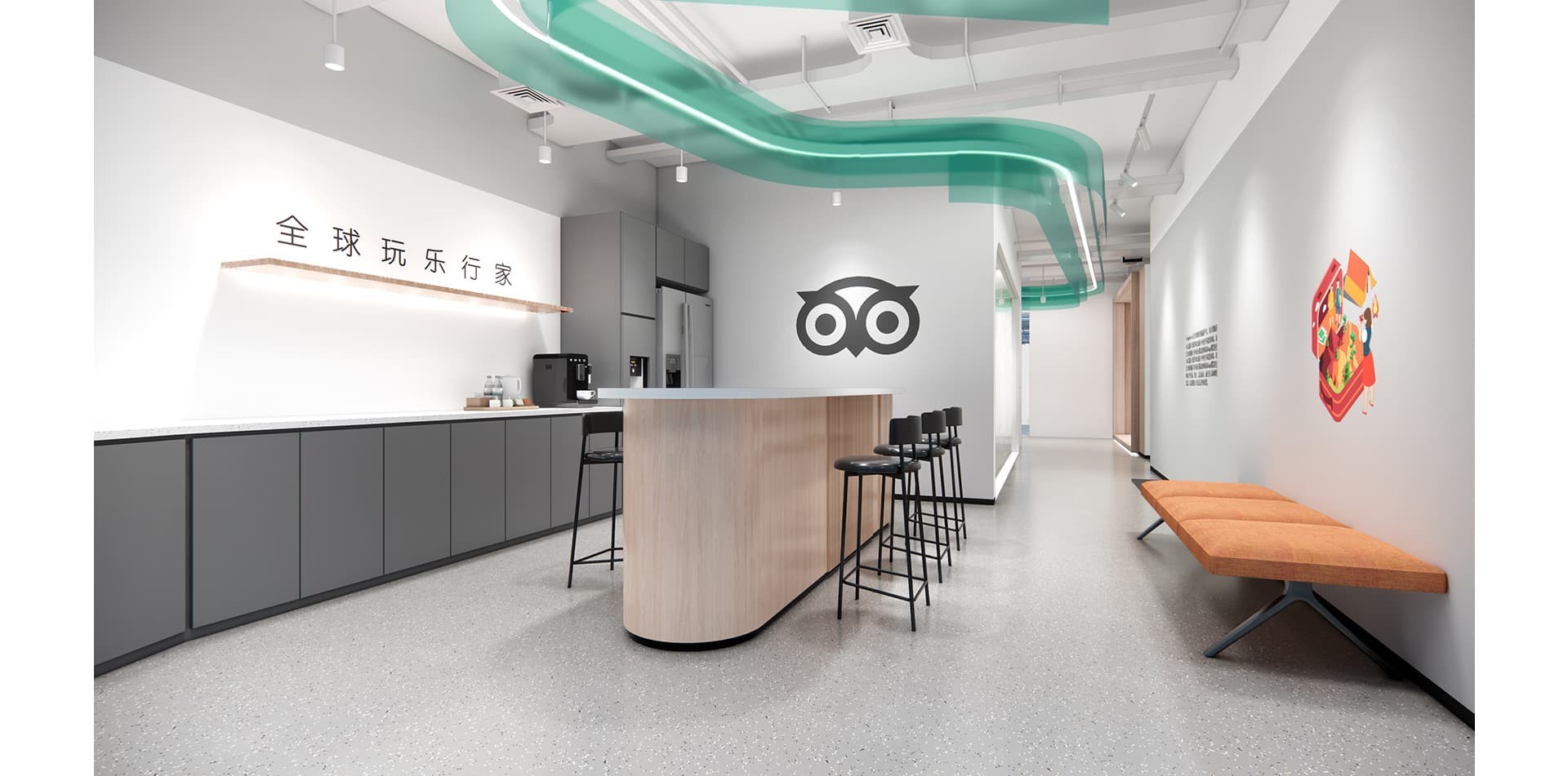 猫途鹰办公室装修设计以简约灵动为基调,融入品牌标志与全球旅行元素,搭配开放式布局与活力色彩,打造兼具协作效率与探索氛围的办公空间。