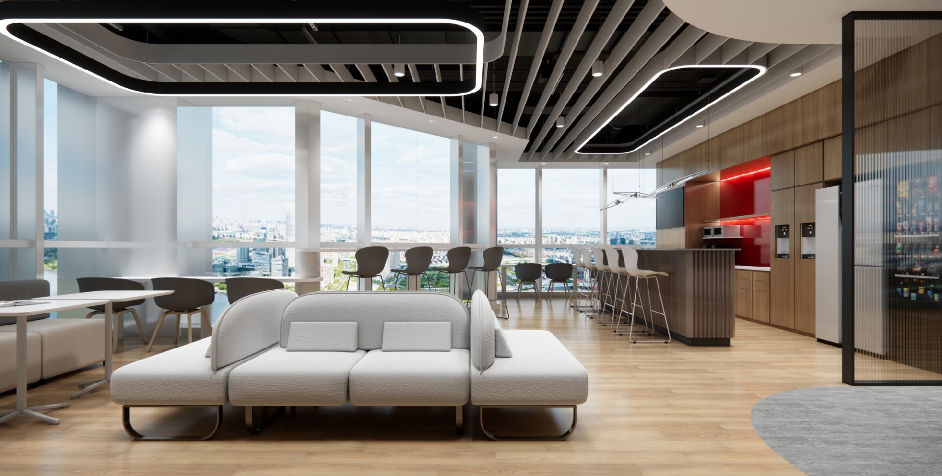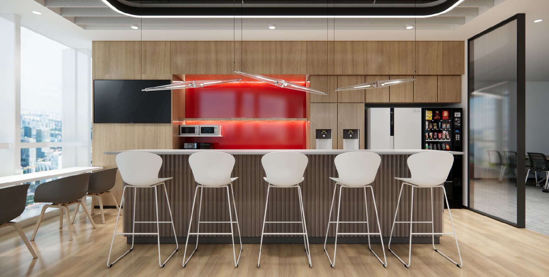 办公室强调空间的开阔感、线条的简洁性以及色彩的和谐搭配,力求去除多余的装饰,让空间更加通透、明亮且易于清洁。以白色为主色调,辅以木质元素,标志的红黑色增加了视觉焦点。所有设计都围绕人的需求展开,求创造一个舒适、高效的工作环境或生活空间。